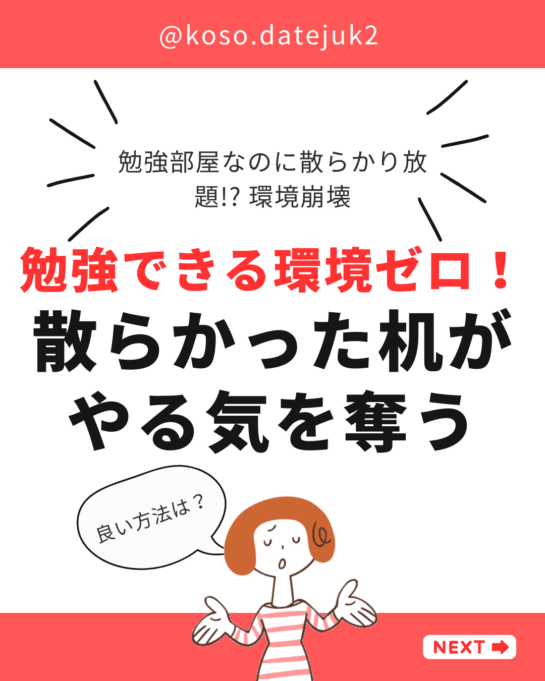 まずは 「机の一部だけを勉強スペースにする」 という小さな工夫から始めること。これが意外と効果的です。